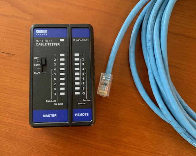 時間の合間にLANコネクタの付替を思い立ちました。が、すっかり結線方法を忘れてしまいました。結線図はネットで見つけ、工具とコネクタを工具箱から探しだしました。