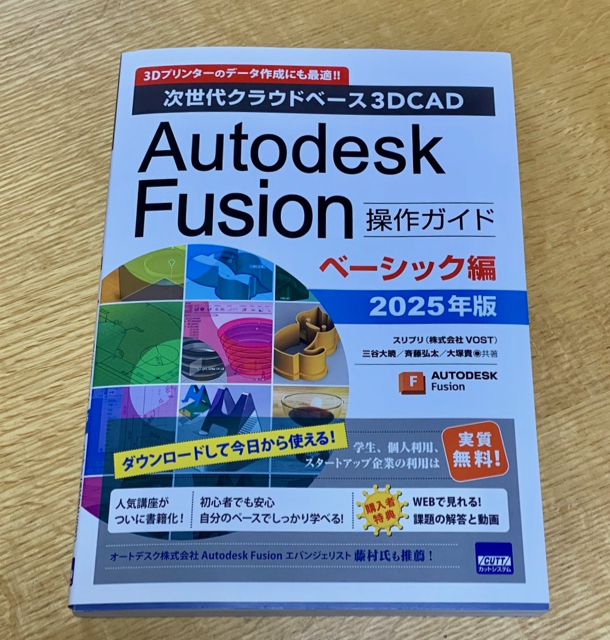 悩みながらもAutodesk Fusionを選択、早速解説本「Autodesk Fusion操作ガイド」を読んでみましたが、流れはつかんだものの全く実感がわきません。やはり使ってみなければ〜 学びに近道はなさそうです。