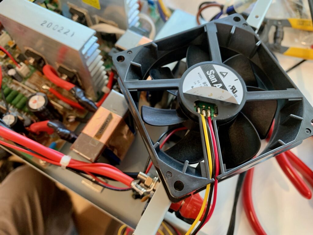 交換用に用意したFANには赤・黒・黄の3本のコードが出ていますが、ハンダ付けを全て外し赤・黒コードの場所に既存の電源配線をつなぎます。期待通り、音も許容範囲に収まりました。