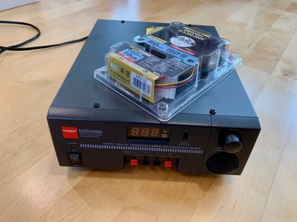 無線機用安定化電源GZD-4000の冷却ファンの音がうるさいので低減を考えました。負荷がかかり内部の温度が設定値に上昇したらファンが回る設計が良いのですが、この機種はファンは常時回っています。コストをかけずに最大負荷(12V 35A)での風量を考慮した設計なのでしょうが、そこまでの使い方をしないので風量を下げても支障はないと考えました。