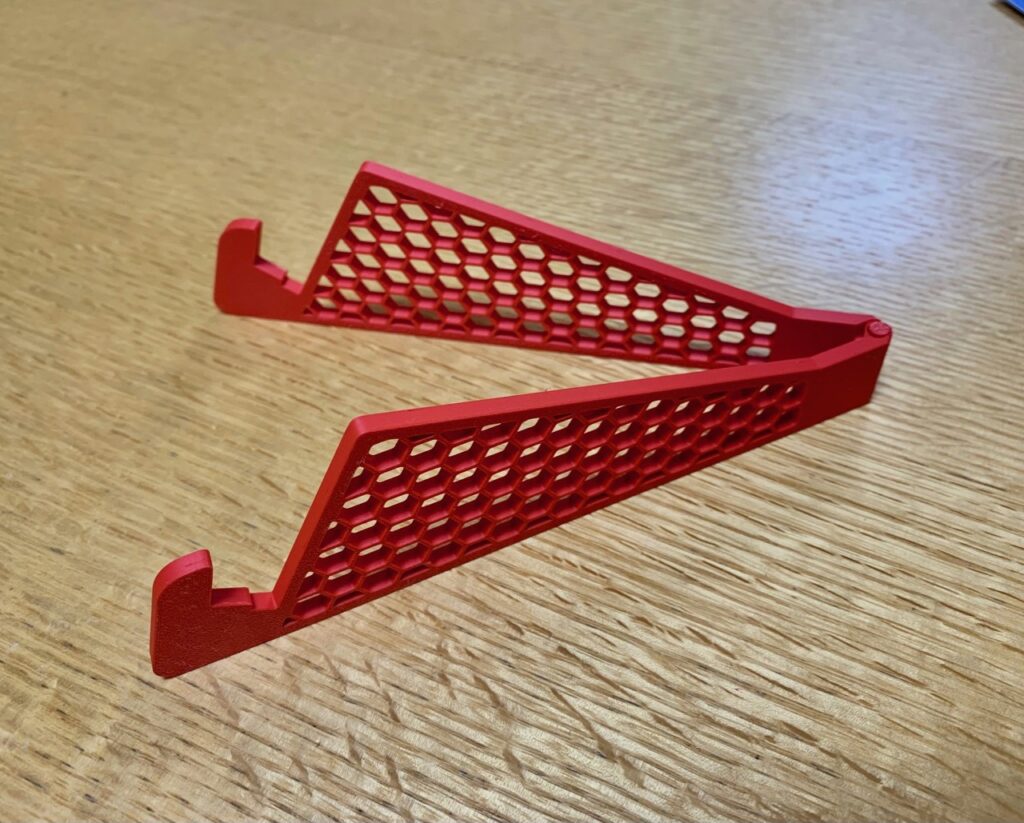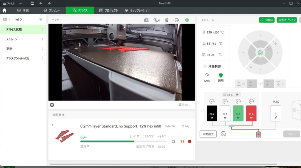 専用ソフトをインストールするとスマートホン、パソコンからプリント操作や状況の確認ができます。庫内にカメラが設置されているからです。便利!! テストプリント用のデータも準備されていますが、いきなり実用的なiPadのスタンドをプリントしてみました。